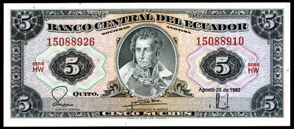 Banco Central Del Ecuador, 1982 Error Banknote with Mismatched Serial Numbers. Ecuador, 5 Sucres, Serie HW, P-108b, Issued banknote, Sucre in middle, back red, an extremely rare Error banknote from ABNC with mismatched serial numbers, S/N 15088926 and 15088910, PMG graded Gem Uncirculated 66 EPQ. Extremely attractive and modern error. ABNC.