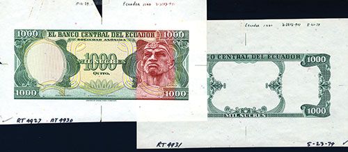 Quito, Ecuador, ND Ca.1984-88, 1000 Sucres, P-125 Unlisted type with American Bank Note Imprint on bottom, Large margin proofs printed on planchetted security paper, CU condition, rare with only 2 or 3 of this variety found in archives. ABNC.
