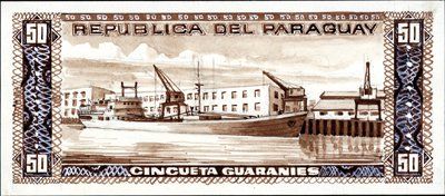 Paraguay. Banco Central Del Paraguay Original Artwork Model. L.1952 (ca.1963). P-197 Essay Artwork. 50 Guaranies Unique back model or mockup essay, that is completely hand painted, of rejected proposed design by Bradbury, Wilkinson & Co., Ltd., that ended up being designed and printed by TDLR. Design of cargo ship at dock being loaded in brown. Unique Paraguay banknote artwork in archive. Choice Unc. BWC.