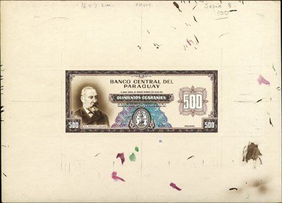 Paraguay. Banco Central Del Paraguay Original Artwork Model. L.1952 (ca.1963). P-200 Essay Artwork. 500 Guaranies Unique face model or mockup essay of rejected proposed design by Bradbury, Wilkinson & Co., Ltd., that ended up being designed and printed by TDLR. The note was partially hand drawn with pieces of borders and cycloid tints added. Unique Paraguay banknote artwork in archive. Choice Unc. BWC.