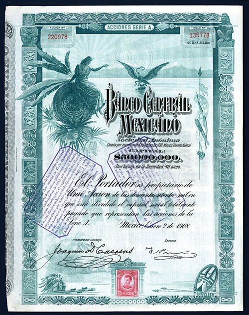 Mexico, January 2, 1908, 100 Pesos = 1 Accion, Ser.A, 34 coupons attached, Uncancelled, Attractive speculative Mexican certificate.