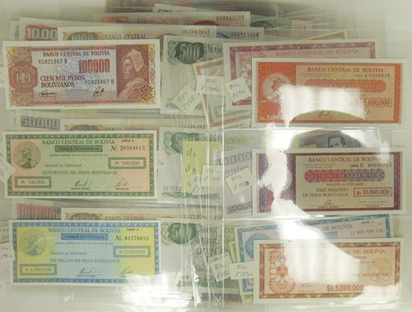 Large assortment of 85 notes. Includes (27) notes from Bolivia, generally good representation from P-153 to P-199, mostly Choice to Gem Unc; and (58) notes from Argentina, with good representation from P-259 to P-324, mostly Choice to Gem Unc. Highlights include Argentina 1 Million Pesos, P-310; 10,000 Pesos P-319; Bolivia 1 Peso, P-158a; 20 Pesos, P-161, low S/N 000170. Please inspect, sold as is. (85 notes)