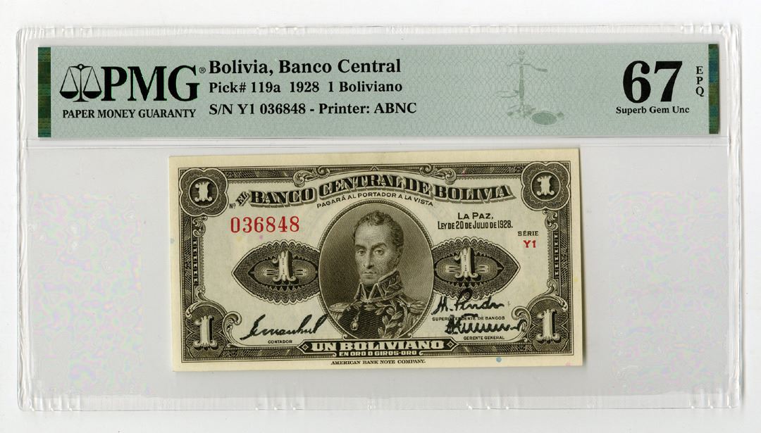 Bolivia, 1928. 1 Boliviano, P-119a, Issued Banknote. Dark gray/brown print. S/N Y1 036848 Printer: ABNC. PMG graded Superb Gem Uncirculated 67 EPQ. This is the highest graded example of this note in the PMG census out of 14 graded.