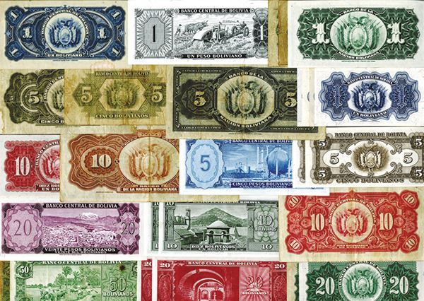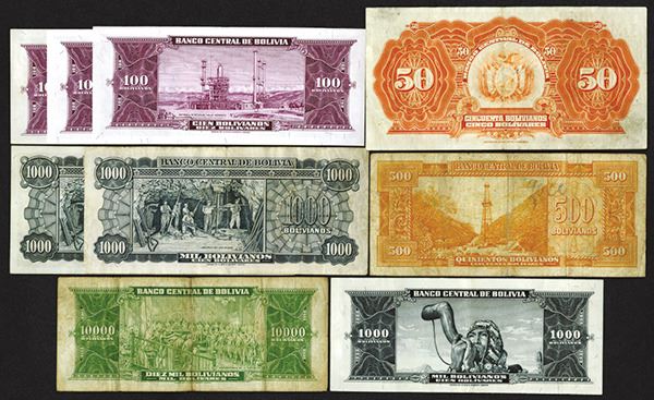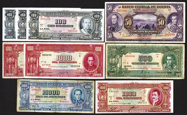 Bolivia. 1, 5, 10, 50, 100, 500, 1000, 10000 Bolivianos. P-112 (3); 113; 114a; 118; 120a; 121a; 123a; 128a (3), c; 129; 130; 131 (2); 138a (2); 139b (2); 140a (2); 141 (2); 142 (3); 143; 144 (2); 149; 151; 152a; 153a; 155a. Bolivar, de Sucre, Villarroel, Murillo on many. Very Good to Uncirculated. Mostly Very Fine or better. 36 pieces