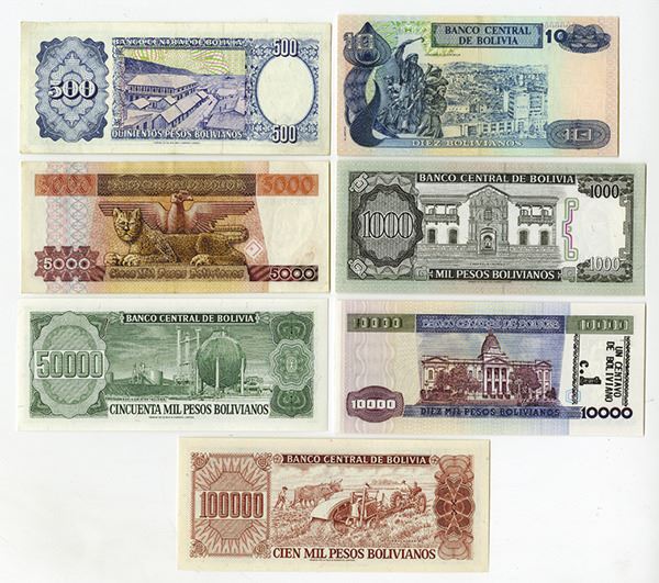 Bolivia, lot includes 500 Pesos, 1981; 1000 Pesos, 1982; 5000 Pesos, 1984; 10000 Pesos, 1984; 50000 Pesos, 1984; 100000 Pesos, 1984; and 10 Bolivianos, 1986. All uncirculated Various printers, including TDLR and Bundesdruckerei.