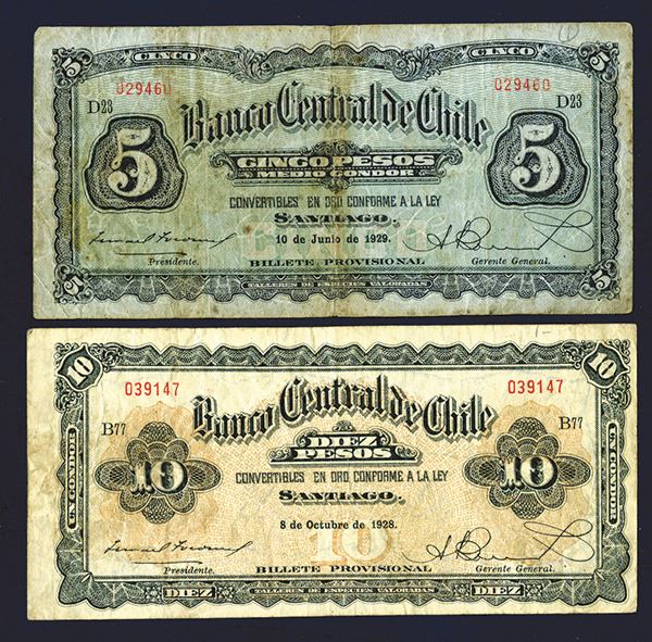 Chile. 5, 10 Pesos. SCWPM 82, 83b. Value flanking bank name. Very Good. First a bit dirty. 2 pieces.
