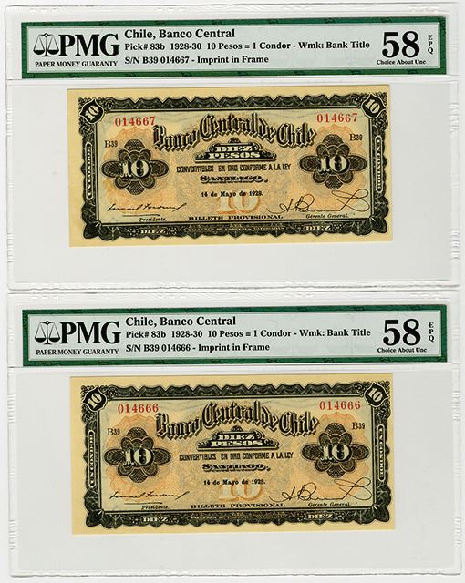 Chile. Pair of issued 10 Pesos, 1928, P-83b. S/N B39 014666-014667, Both are PMG graded Choice About Unc 58 EPQ (Cert # 5003606-016 & 5003606-017). Sequential Pair.