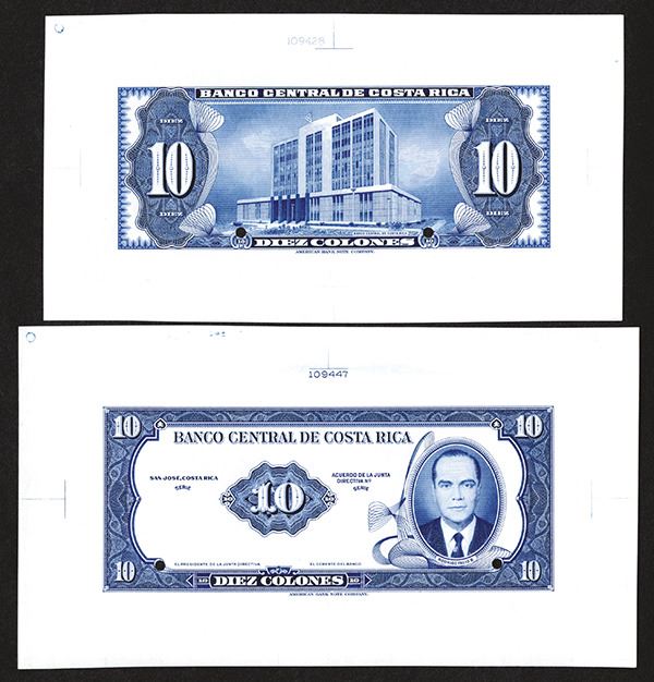 Costa Rica. 10 Colones. P-230. Brenes at right. Banco Central building on back. Uniface blue plate (main color) uniface proof on india paper. Full wide margins, plate numbers and crop marks. POCs on the face proof, pencil notations on back of both. As made 2 pieces.