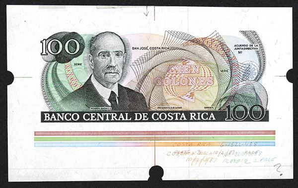 Costa Rica. 100 Colones. SCWPM 254 NL. Full color process proof of both sides on one sheet. With registration mark on larger page. ABNC. As made without signatures, date, serial numbers, old tape at top probably for mounting in presentation folder.