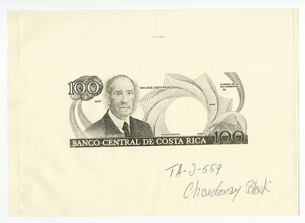 San Jose, Costa Rica. 100 Colones, P-254 Unlisted progress proof, Black on large format white paper, Plate # 113709 on top, Hand written "TA-J-559 Chardonnay Black" written on back, Intaglio printed, Only 3 examples were found in the ABN archives in 2005. ABNC.