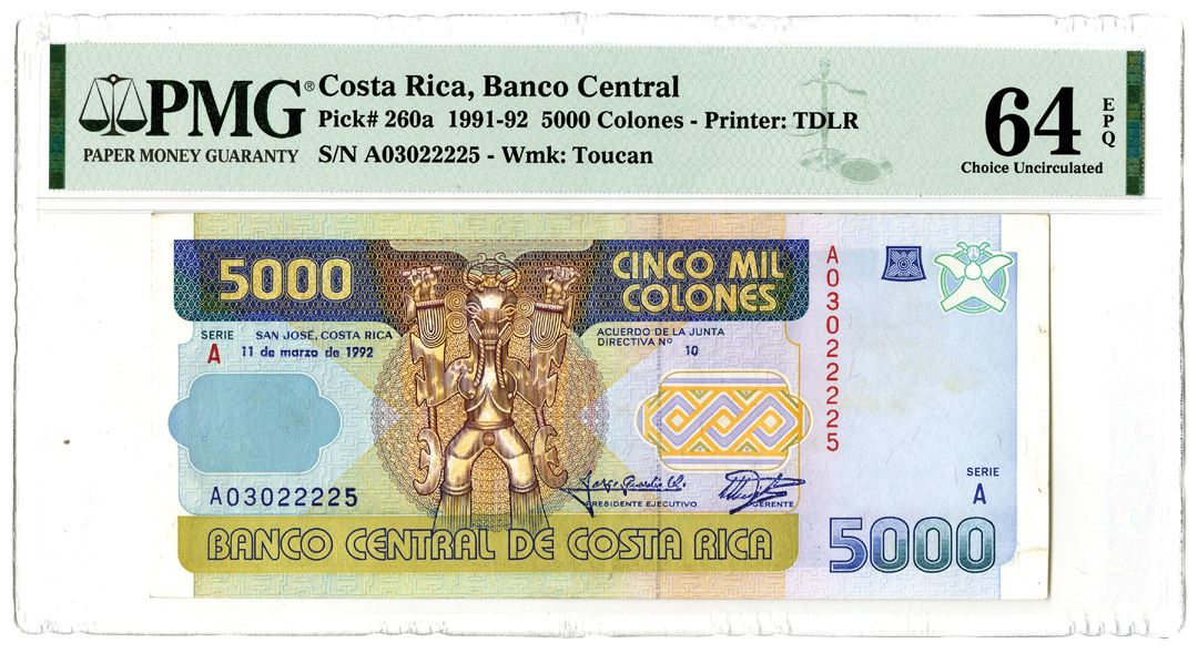Costa Rica. 1992. 5000 Colones, P-260a, issued banknote, PMG Graded Choice Uncirculated 64 EPQ, TDLR.