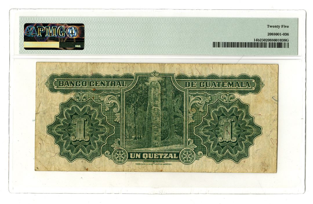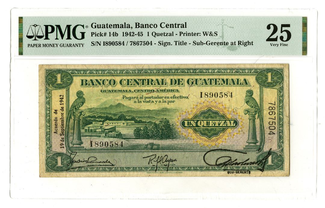 Guatemala, 1942-45. 1 Quetzal, P-14b, Issued banknote, Green on lavender and yellow underprint, S/N I890584/7867504, Sign. Title - Sub-Gerente at Right, PMG graded Very Fine 25. Printer: W&S.