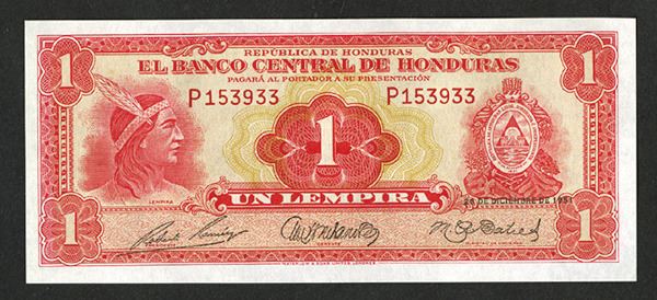Honduras. 1 Lempira. P-45b. 28.12.1951. Last date of the type. Choice AU to Unc. W&S.