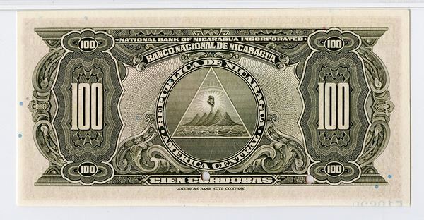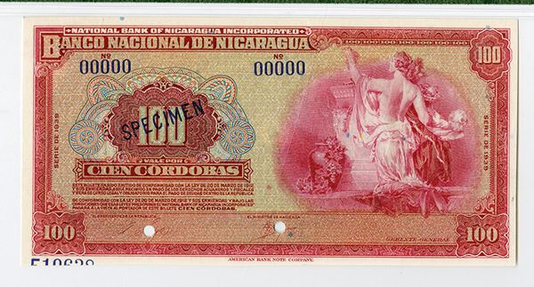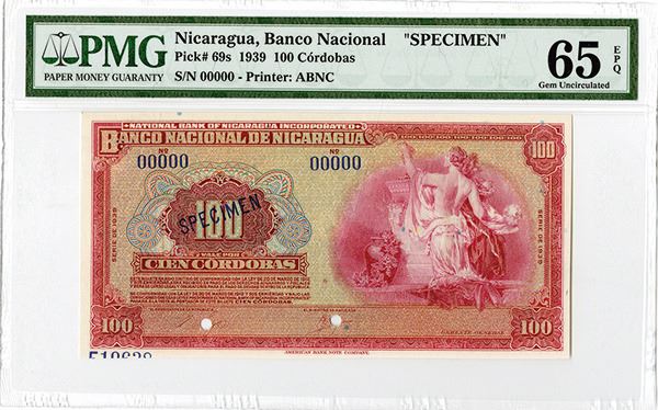 Nicaragua, specimen 100 Cordobas, P-69s, 2 POCs, SPECIMEN overprint, RED ON M/C, PMG graded Gem Uncirculated 65 EPQ. ABNC. Unpriced issued in the SCWPM, only priced as a specimen.