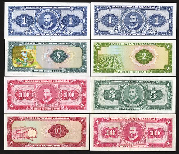 Nicaragua. Lot of 8 notes. 1, 2, 5, 10 Colones. Variety of dates and types. 4 are Choice VF-XF and 4 are Uncirculated to CU. 8 pieces.