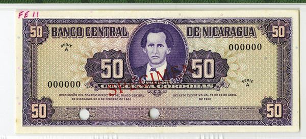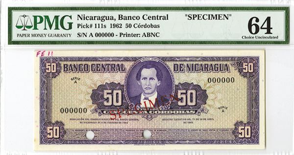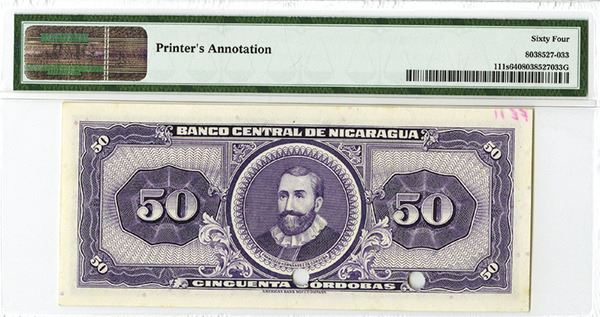Nicaragua, 50 Cordobas, P-111s, Specimen banknote, Purple on m/c, Maximo Jerez portrait in middle, back purple, 2 POC's, SPECIMEN overprints, PMG graded Choice Uncirculated 64. Printer's annotation on top left corner, ABNC.