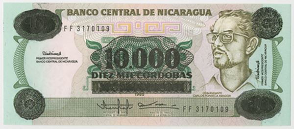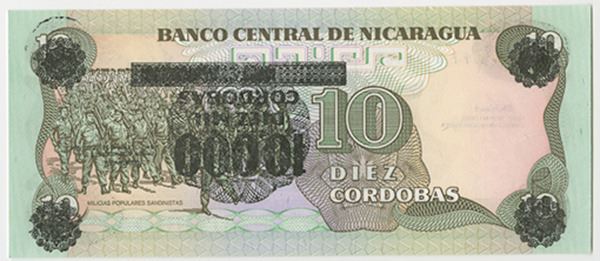Nicaragua. Issued 10,000 Cordobas overprinted on 10 Cordobas host, P-158, printing error with excess ink applied to overprint that it is visible inverted on the reverse. Choice Unc.