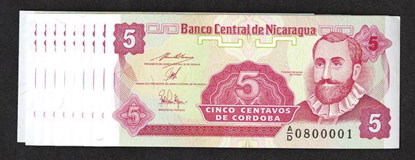 Nicaragua. 5 Centavos. SCWPM 168a. Cordoba at right, national arms at left. Serial # A/D 0800001-0800010. Choice Uncirculated. 10 pieces