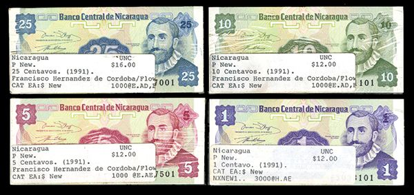 Banco Central de Nicaragua, ND (1991) Issue, 4 Packs of Banknotes Nicaragua, lot of 4 packs of 100 UNC notes, includes 1 Centavo, P-167; 5 Centavos, P-168; 10 Centavos, P-169; and 25 Centavos, P-170. weight approximately 1 lb.