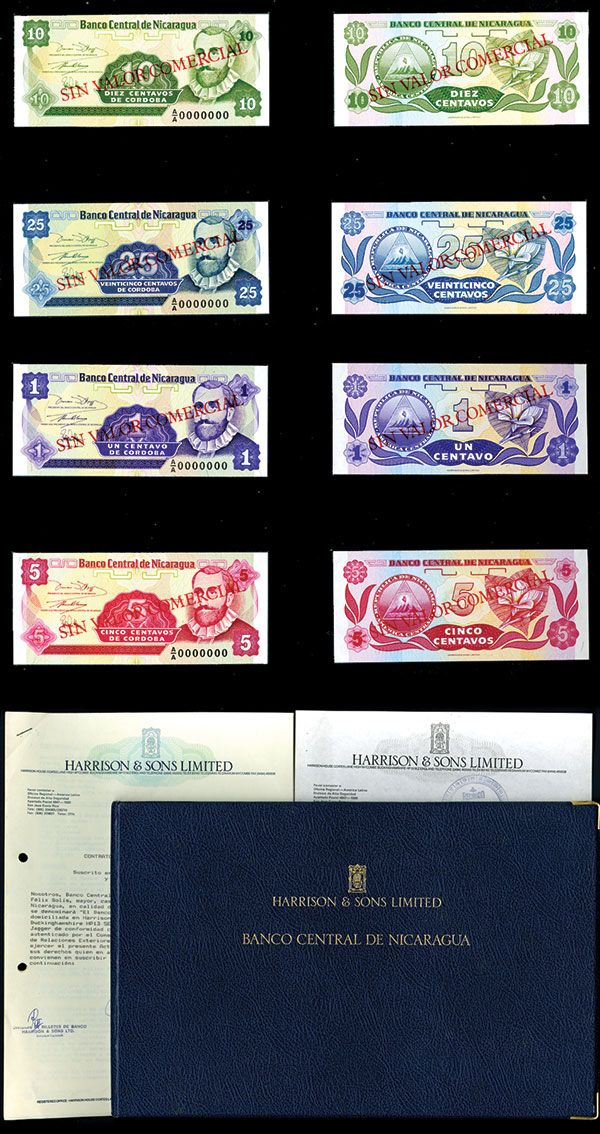 Nicaragua, Lot of 4 notes and 78 pages of in-depth correspondence regarding the design, printing, pricing and related matters on official Harrison & Sons stationary as well as official bank correspondence including signature sheets of the president, vice president and treasurer of the bank. The notes include ND (1991), 1 Centavo; 5 Centavos; 10 Centavos and 25 Centavos, P-167 to P-170, There are a total of 8 banknotes, the obverse is on the left of each page and the reverse on the right side of the same page, mounted on 2 pages in issued colors, we are not certain if they are uniface or fully printed notes. Mounted in a gold letter leather portfolio with "Harrison & Sons Limited - Banco Central De Nicaragua on the cover, the notes are in Gem condition, the correspondence is in excellent condition and written in Spanish and English. This is the first time we have had the privilege to offer an insight into the design and production of notes by Harrison & Sons. Unique with correspondence that will further dramatically the knowledge of this issue.