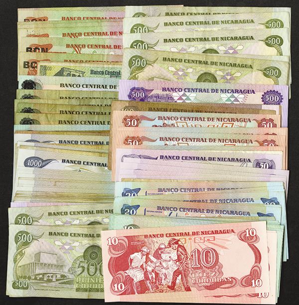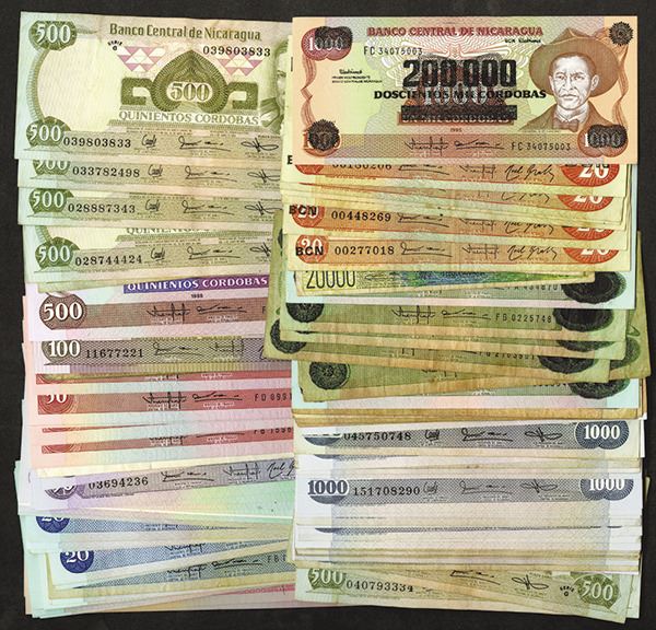 Nicaragua. 10, 20, 50, 100, 500, 1000, 5000, 10000, 20000, 200000 Cordobas. Many Very Good and dirty, about 40 are Uncirculated. 119 pieces.