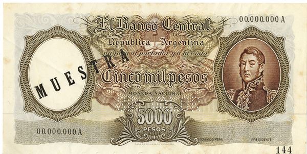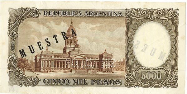 Argentina, 5000 Pesos, P-280s, Specimen, Muestra overprint on face and back, brown, Pin-punch "Sin Valor", Choice XF to AU with some light toning. Scarce as specimen.