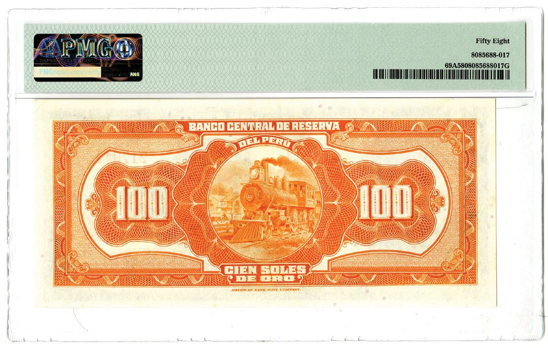 Peru. 1941-50. 100 Soles, P-69A, Issued banknote, Black on multicolor underprint, S/N A3 217344, PMG graded Choice About Uncirculated 58. Printer: ABNC. Only one grades higher out of 4 graded in the PMG census.