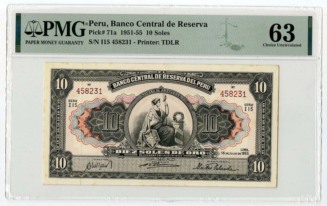Peru, 1951-55. 10 Soles, P-71a, Issued Banknote. S/N 115 458231, Printer: TDLR. PMG graded Choice Uncirculated 63 with comment "minor discoloration and stains"