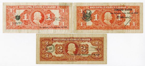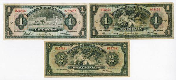 El Salvador. Lot includes 1 Colon, 1934, P-75, Fine; 1 Colon, 1944, P-83, Very Fine; and 2 Colones, 1951, P-84, Fine. All ABNC.