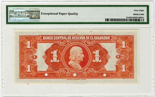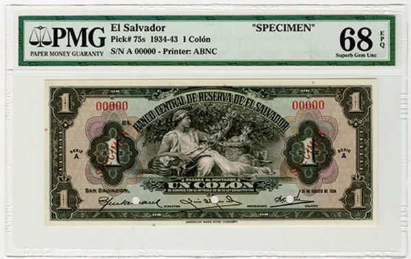 El Salvador. Specimen 1 Colon, 1934, P-75s. PMG graded Superb Gem Unc 68 EPQ (Cert # 5003614-005). ABNC.