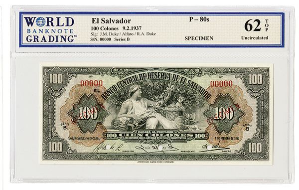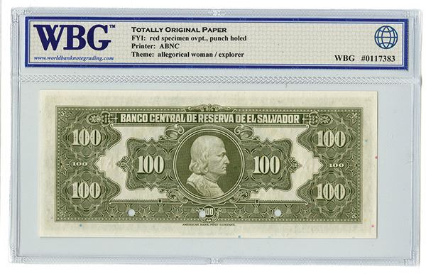 El Salvador. Specimen 100 Colones, 1937, P-80s. WBG Uncirculated 62 TOP. ABNC.
