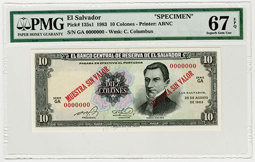 El Salvador. Specimen 10 Colones, 1983, P-135s1. PMG graded Superb Gem Unc 67 EPQ (Cert # 5003614-004). ABNC.