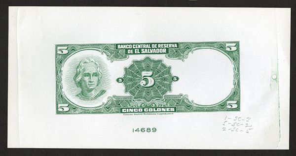 El Salvador. 5 Colones. Columbus portrait at left. P-111 for type, unlisted in this form. Uniface proof on large paper with registration holes in very wide border. Choice to Gem Uncirculated. Color notations in margin. USBNC