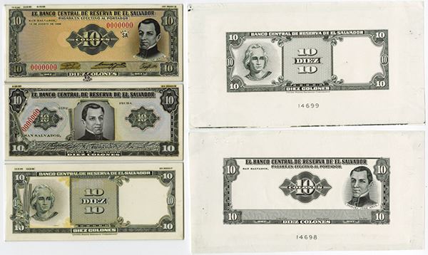 El Salvador. 10 Colones. P-112 for type, but unlisted in this form. Two face paste-ups, one of an unused proposed design and the other of the used note, as well as a paste-up of the back. These three are all on board wrapped in acetate. IN addition two black plate proofs of the approved face and back designs with huge intaglio embossing. Wonderful production items from the United States Banknote Company. As made. 5 pieces.