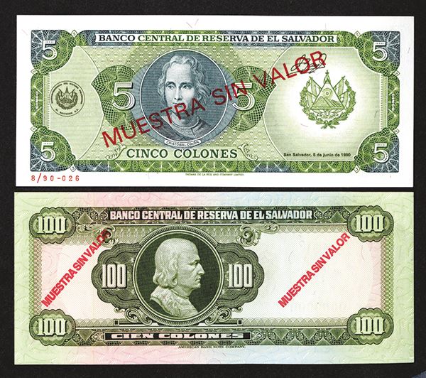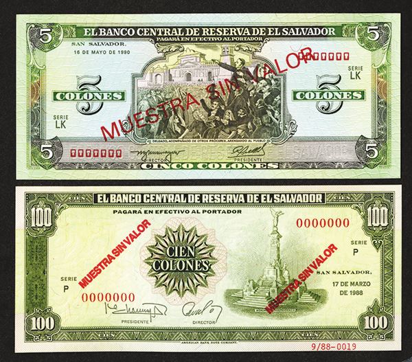 El Salvador. 100 Colones, 1988. SCWPM 137s1. Independence monument at right. ABNC. Overprinted twice on each side, numbered 9/88-0019 in lower right margin; 5 Colones, 1990. SCWPM 138s. Overprinted in red on each side, numbered in back left margin 8/90 026. Both Choice Uncirculated. 2 pieces.