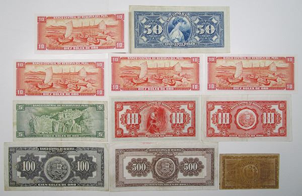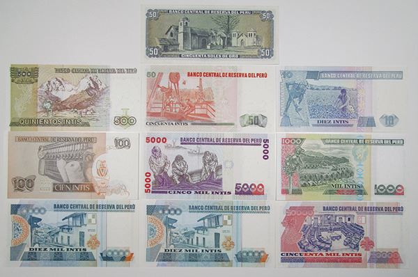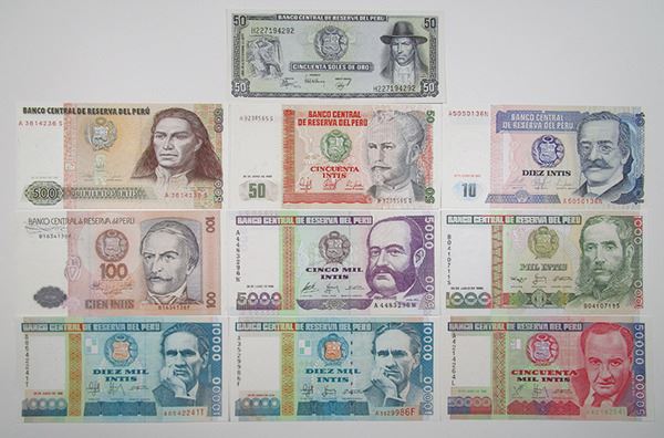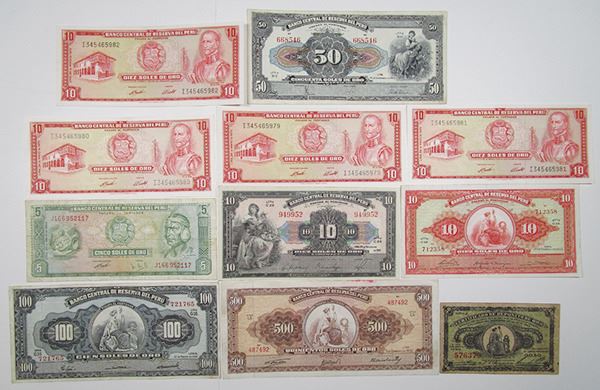 Peru. Lot includes an assortment of 50 Centavos, 5, 10, 50, 100, 500 Soles de Oro and 10, 50, 100, 500, 5000, and 50000 Intis banknotes. P-30; 67A; 68A; 86; 87; 88; 99; 100 (4); 107; 129; 131; 133; 134; 136; 137; 140; 141; 142. Generally XF or better, some Fine-VF. (21)