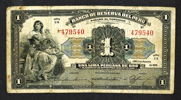Peru. 10 Soles on 1 Libra. P-57. Bold overprint of Bank name and new denomination on back. Fine, light spotting.