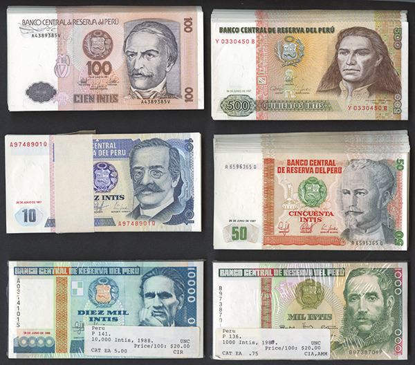 Peru. 10, 50, 100, 500, 1000, 10000 Intis. P-129; 131b; 133; 134b; 136b; 140. 3 in sealed packs of 100 pcs, 3 are loose but count close to 100 pcs. So Over 550 pieces in the lot. All but a few are Choice Uncirculated.