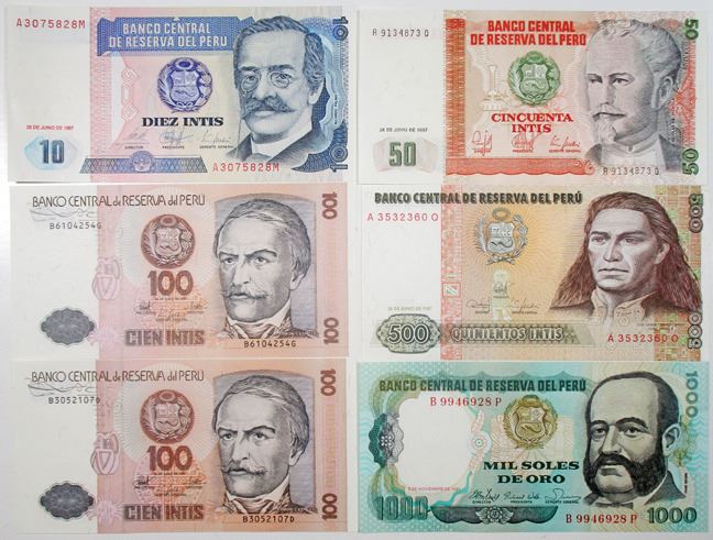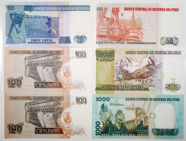 Peru....., 1981-88. Lot of 12 Issued Banknotes, Includes: 5000 Soles de Oro, P-117c; 1000 Soles de Oro, P-122a; 10 Intis, P-128; 50 Intis, P-131b; 100 Intis, P-133 (2); 500 Intis, P-134b; 1000 Intis, P-136b (2); 5000 Intis, P-137; 10,000 Intis, P-140; 50,000 Intis, P-142. Notes range from AU to CU condition or better. (12). Sold "AS IS" no returns accepted.
