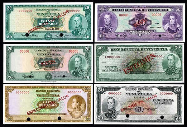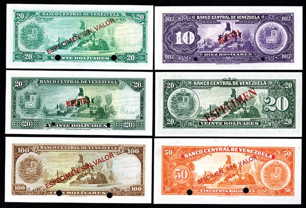Banco Central de Venezuela, 1960s-70s, Group of 6 Specimen Banknotes Venezuela, lot of 6, includes 100 Bolivares, P-48s1; 50 Bolivares, P-47s; 20 Bolivares, P-46s1; 20 Bolivares, P-43s1; 20 Bolivares, P-52s; and 10 Bolivares, P-51s1. All UNC. First 4 TDLR, last 2 ABNC.