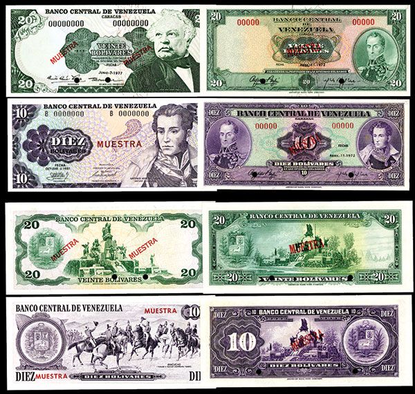 Venezuela, lot of 4 specimen banknotes, includes 10 Bolivares, 1972, P-51s1; 20 Bolivares, 1972, P-52s, 10 Bolivares, 1981, P-60s; and 20 Bolivares, 1977, P-53s2. ABNC. All notes are UNC.
