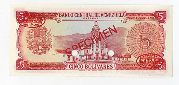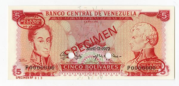 Venezuela. 1972, 5 Bolivares, P-50fs, Specimen Banknote, TDLR, Specimen No 013. Gem Unc. (Hammurabi Collection of Serial #13 Notes)