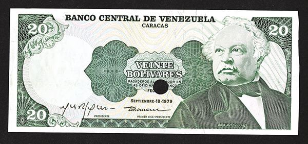 Venezuela. 20 Bolivares. 18.9.1979. SCWPM 53s3. POC as made, uneven right edge of paper. VF-EF, back a bit dirty.