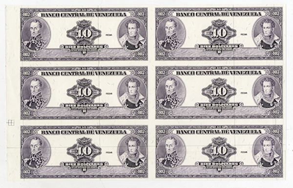 Venezuela. Uncut Proof Sheet of 6 notes of 10 Bolivares, P-61 Unlisted. Bolivar on left and Sucre at right, Printed in purple on paper with multi-color silk fibers and 1 vertical security thread running vertically through the right middle of each note. All with blank back. Pencil line on bottom from production department. The 4 top notes are Uncirculated to Choice Uncirculated or better with the 2 bottom notes with a light horizontal fold thus they grade Choice XF to AU condition. Rare in this format. ABNC without imprint.