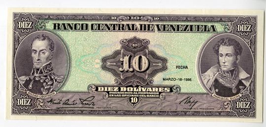 Venezuela, 1986. 10 Bolivares, P-61a, Uniface Progress Proof. Purple on light green and lilac underprint with portrait of Antonio Jose de Sucre at right and Simon Bolivar at left. Back is blank. Printed on banknote security paper with silk threads, Uncirculated or better condition. ABNC.