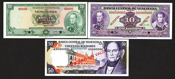 Venezuela. 10, 20, 50 Bolivares. SCWPM 51s2 27.1.1976; 52s 11.4.1972; 54s 21.11.1972. Bold embossing. First two with POCs as expected. All Choice Uncirculated. 3 pieces.