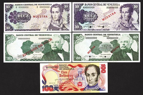 Venezuela. 10, 20, 100 Bolivares. SCWPM 53s3, 57s, 59s, 60s, 63s. The 60s with a small bit to paper tone, otherwise all Choice Uncirculated. 5 pieces.