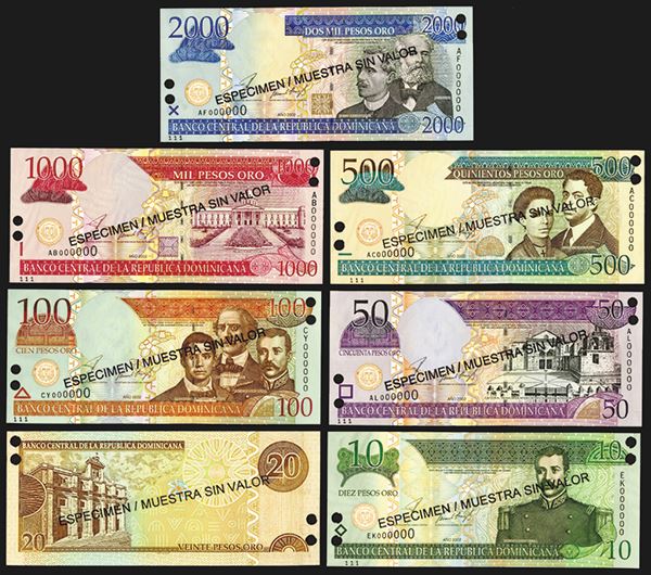 Dominican Republic. Banco Central de la Republica Dominicana. 2002 Issue. 10, 20, 50, 100, 500, 1000, 2000 Pesos. All with black overprint: ESPECIMEN / MUESTRA SIN VALOR on both sides, two POCs at lower left and top right ends, and with matching margin numbers 111. SCWPM 168s2; 169s2; 170s2; 171s2; 172s1, 173s1, 174s1. All Choice Uncirculated or better. 7 pieces.