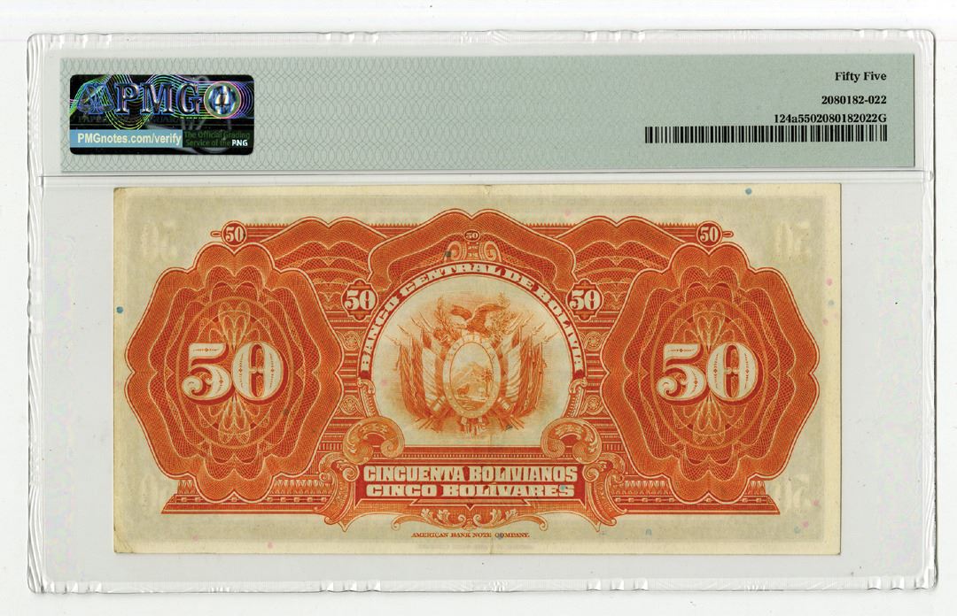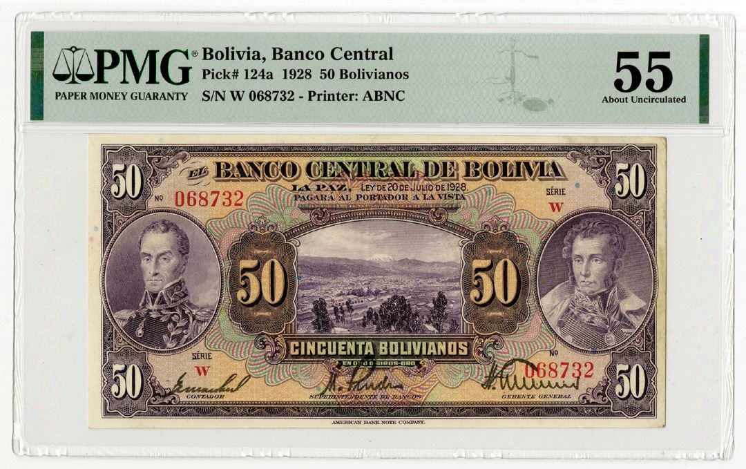 Bolivia, 1928. 50 Bolivianos, P-124a, Issued Banknote. Purple and m/c underprint. S/N W 068732. PMG graded About Uncirculated 55. Printer: ABNC