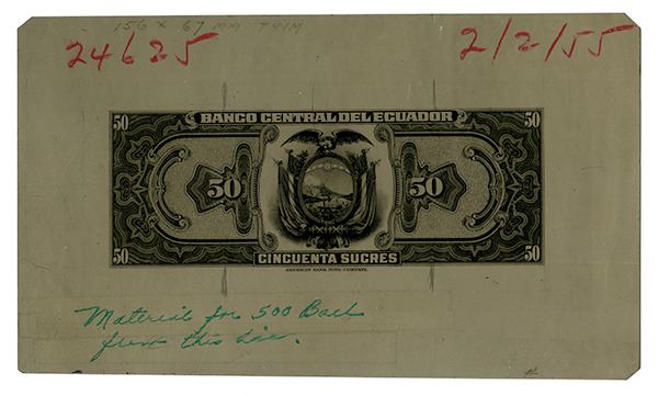 Ecuador. Back photo proof of 50 Sucres, P-104, printed on 1mm thick metal plate, with printer annotations "2/2/55", "24625", "156x67mm trim", and "Material for 500 Back from this die." Very unusual. ABNC. From the ABNC production department. As made.